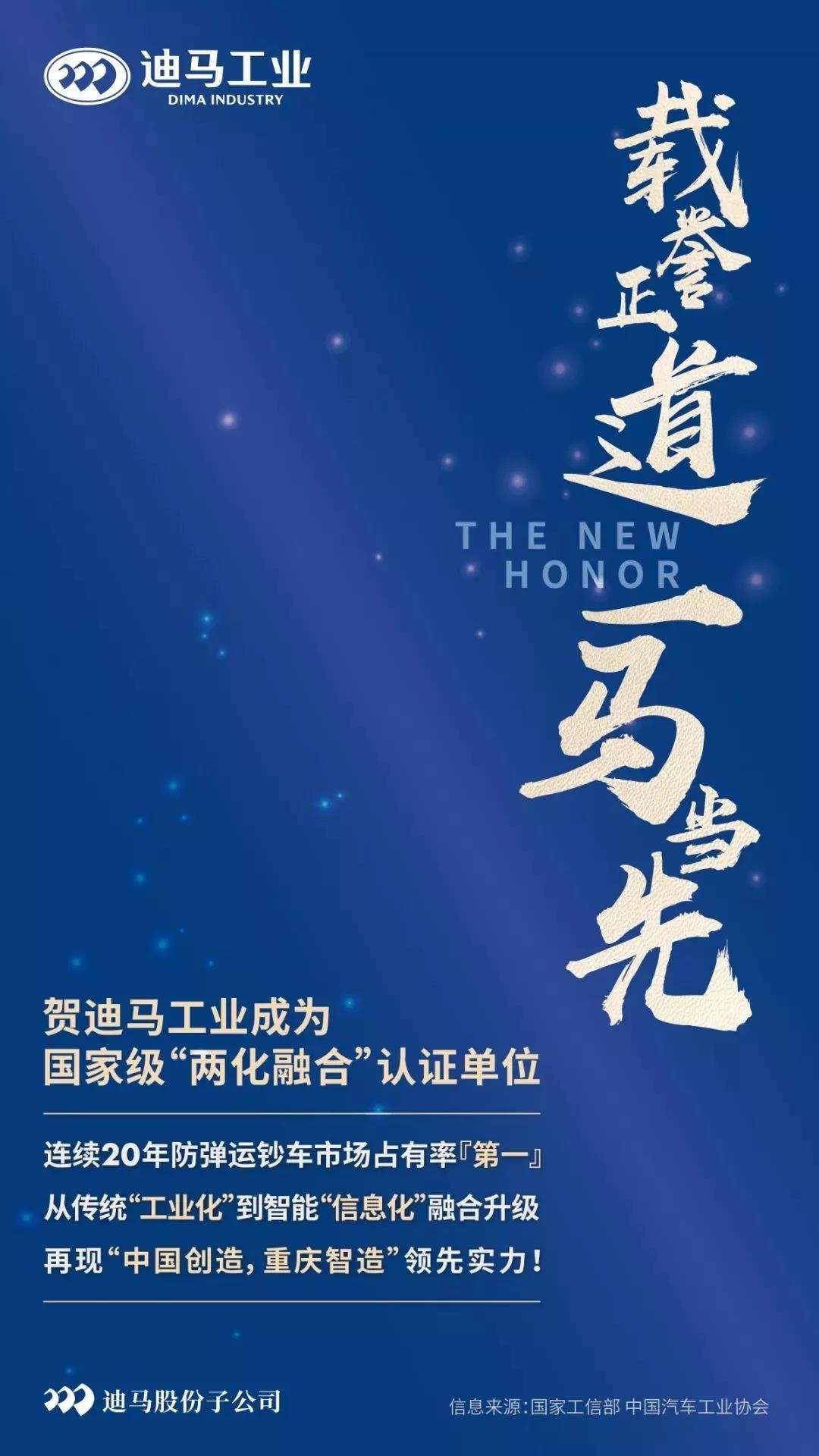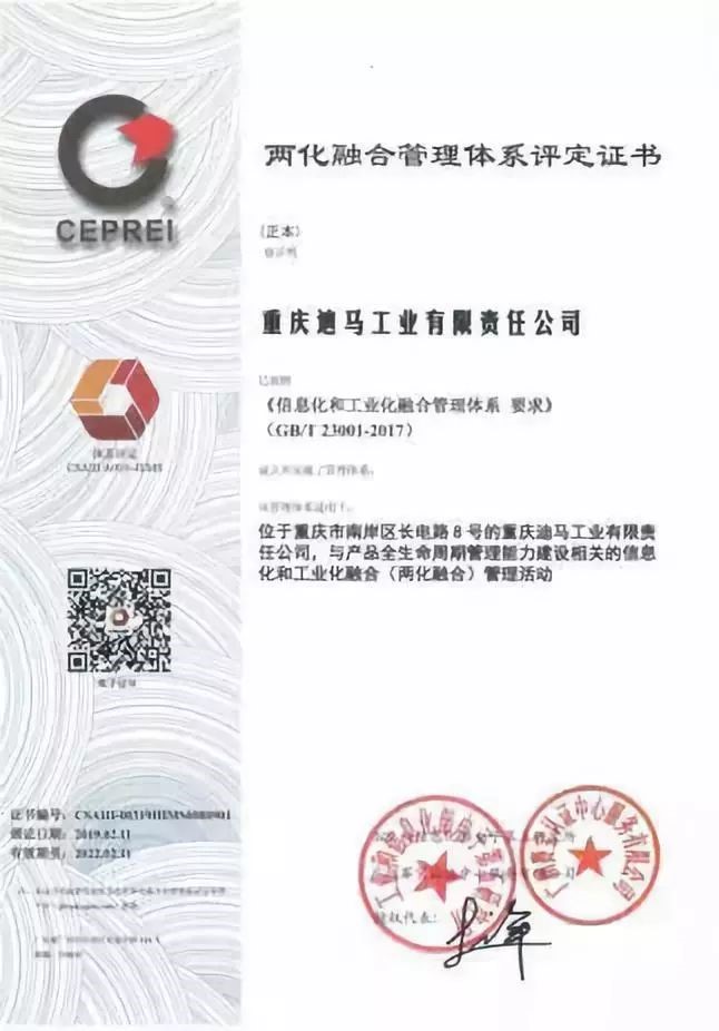 近日,迪馬工業(yè)獲得了由國家工信部、中國汽車工業(yè)協(xié)會(huì)發(fā)布的《兩化融合管理體系評定證書》,作為特種車領(lǐng)域的標(biāo)桿企業(yè),迪馬工業(yè)始終保持行業(yè)的領(lǐng)先地位。